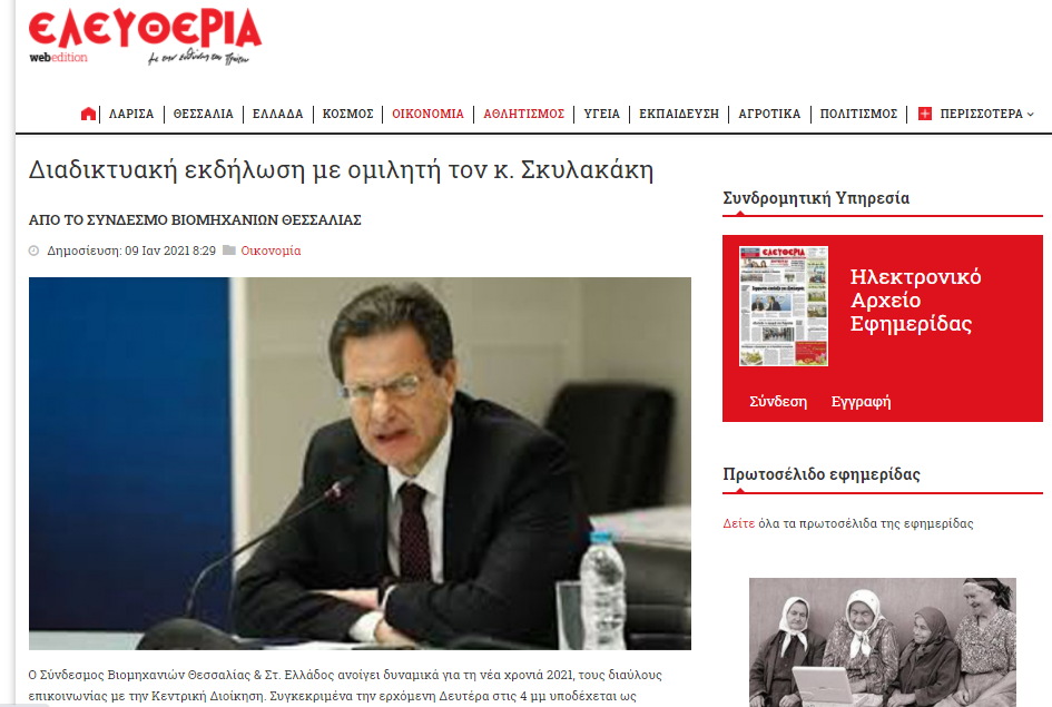 Παρέμβαση διάψευσης προς το thessaliaeconomy.gr είχαμε από τον Σύνδεσμο Βιομηχανιών Θεσσαλίας (ΣΘΕΒ) για δημοσίευμα σύμφωνα με το οποίο ο αναπληρωτής Αναπληρωτής Υπουργός Οικονομικών Θεόδωρος Σκυλακάκης θα εμφανιστεί ταυτόχρονα μέσω διαδικτύου, τόσο σε συνεδρίαση του Συνδέσμου Βιομηχανιών Θεσσαλίας και Στερεάς Ελλάδος (ΣΒΘΣΕ) όσο και στον ΣΘΕΒ. Κατά παράδοξο τρόπο την ίδια ώρα και με τo ίδιο θέμα ομιλίας και στους δύο συνδέσμους.
