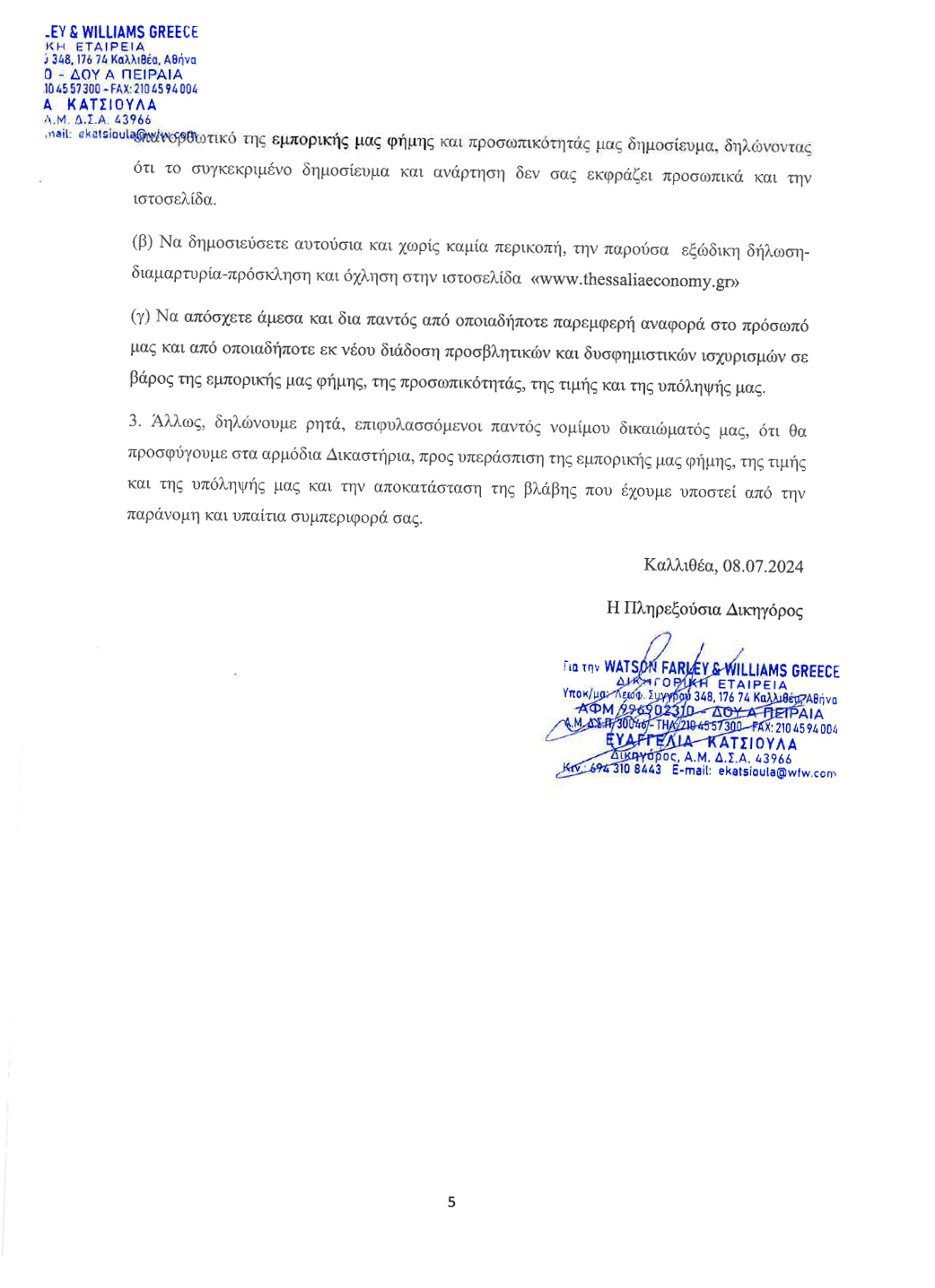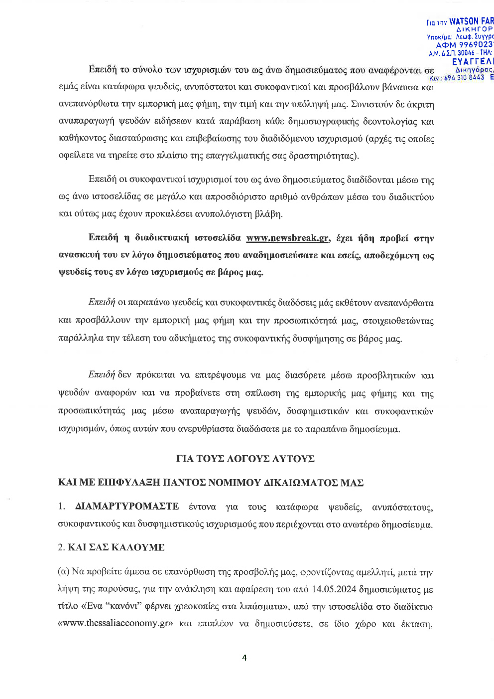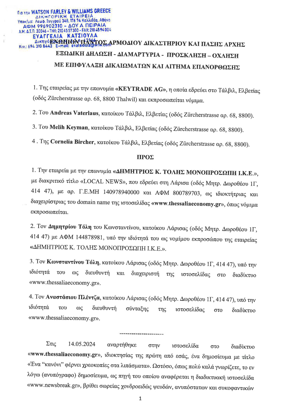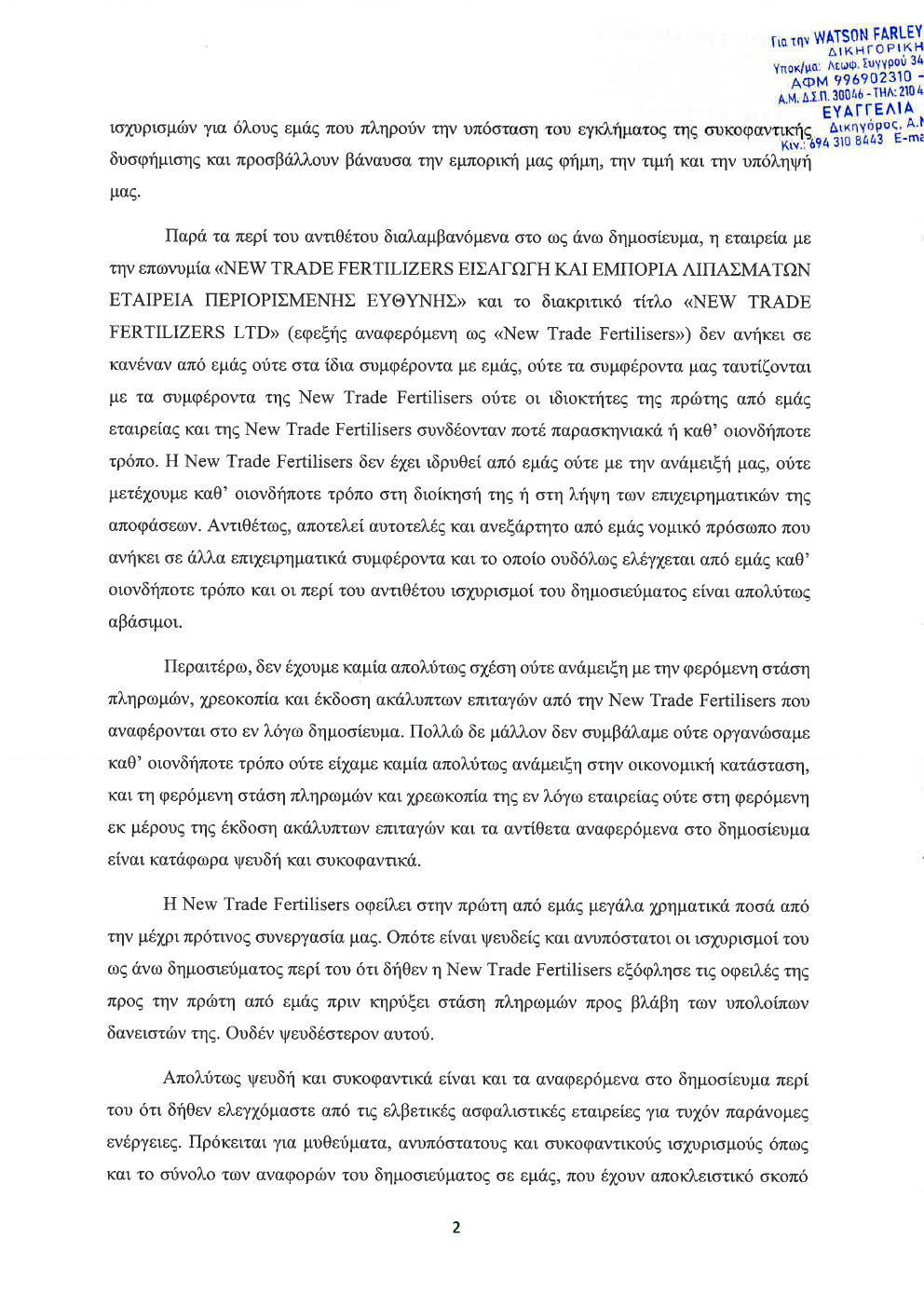 Σχετικά με δημοσίευμα που είχαμε αναρτήσει στην ιστοσελίδα μας στις 14 Μάϊου 2024, με τίτλο «Ένα "κανόνι" φέρνει χρεοκοπίες στα λιπάσματα», έχουμε να δηλώσουμε ότι ήταν προϊόν αυτούσιας αναδημοσίευσης από ιστοσελίδα των Αθηνών το περιεχόμενο του οποίου δεν υιοθετούμε και ζητούμε συγνώμη για πρόσωπα που ακουσίως θίξαμε. Για τον λόγο αυτό η σχετική ανάρτηση ανακλήθηκε, ενώ δημοσιεύουμε εξώδικη δήλωση που μας εστάλη από την εταιρεία Keytrade A.G, τους κυρίους Andreas Vaterlaus, Melih Keyman και την κυρία Cornelia Bircher: