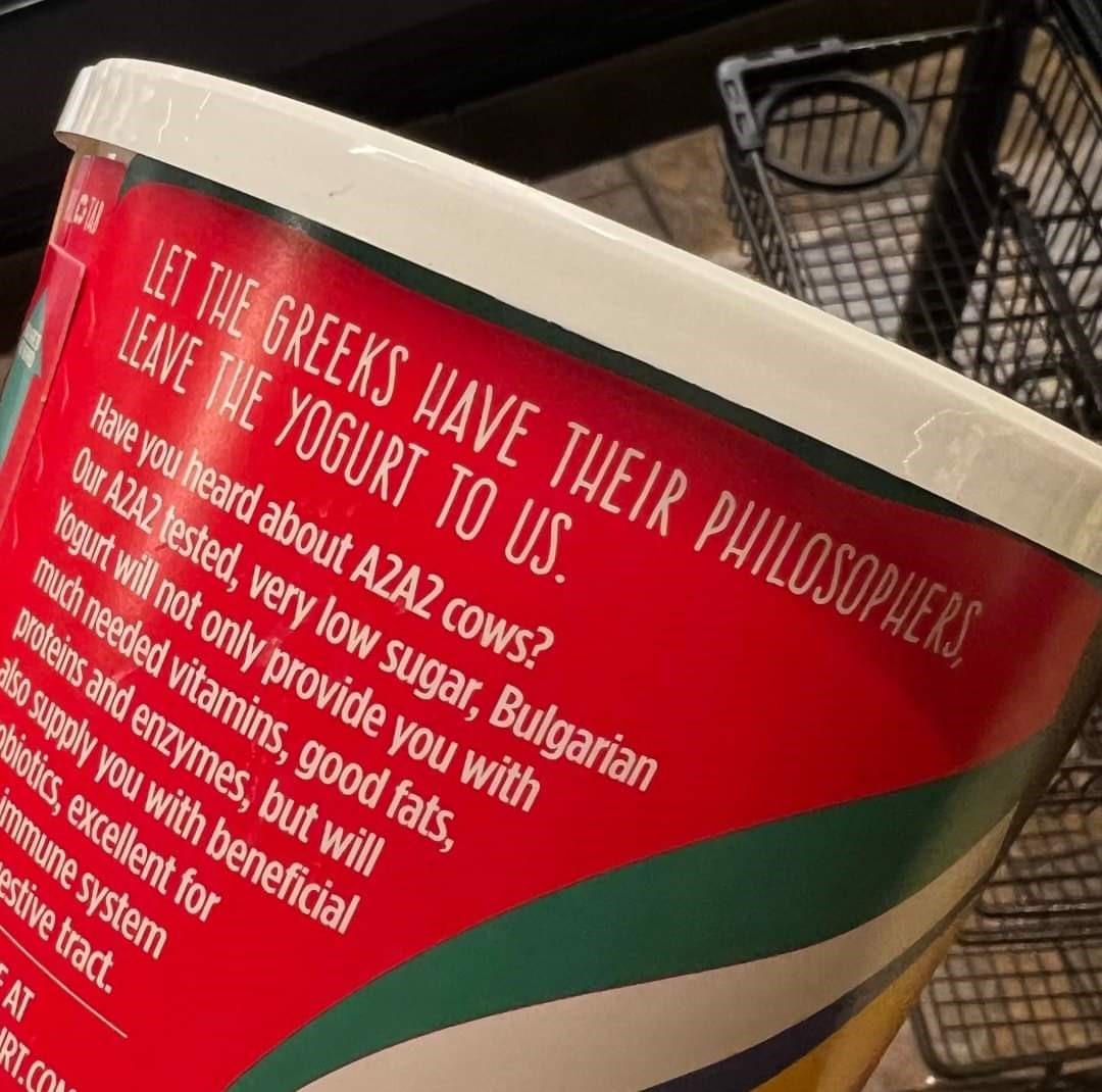 Ανακοίνωση εξέδωσε ο Σύνδεσμος Ελληνικών Βιομηχανιών Γαλακτοκομικών Προϊόντων (ΣΕΒΓΑΠ) αναφορικά με προϊόν γιαουρτιού που εντοπίστηκε στην αγορά της Ν. Κορέας, από την εταιρεία Trimona Foods με έδρα τη Νέα Υόρκη, στην οποία αναγραφόταν «Άστε τους Έλληνες να έχουν τους φιλοσόφους τους, αφήστε το γιαούρτι σε εμάς» (φωτο).